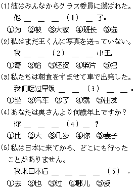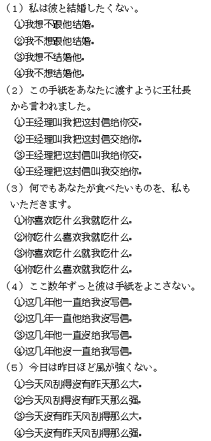 【問題2】次の(1)〜(5)の日本語に相当する中国語として最も適当なものを、それぞれ下の@〜Cのうちから一つずつ選べ。